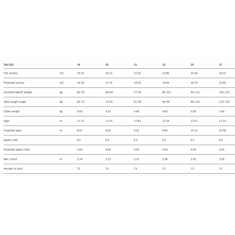 La TAU DLS est une voile deux lignes se situant dans le segment supérieur de la catégorie EN-C, réservée exclusivement aux pilotes très expérimentés, orientés vers la performance, adeptes du vol de distance et de la compétition. Elle requiert plusieurs années d'expérience de vol, une pratique régulière avec au moins 100 heures de vol par an et une expérience approfondie sur au moins une voile de classe sport. La TAU DLS ne convient pas comme première voile de transition vers la classe C.