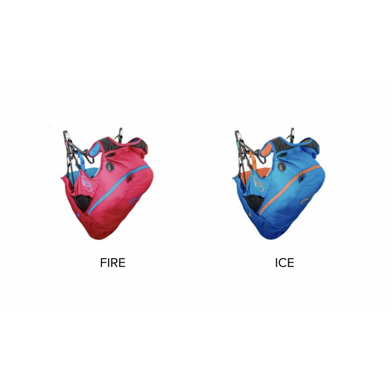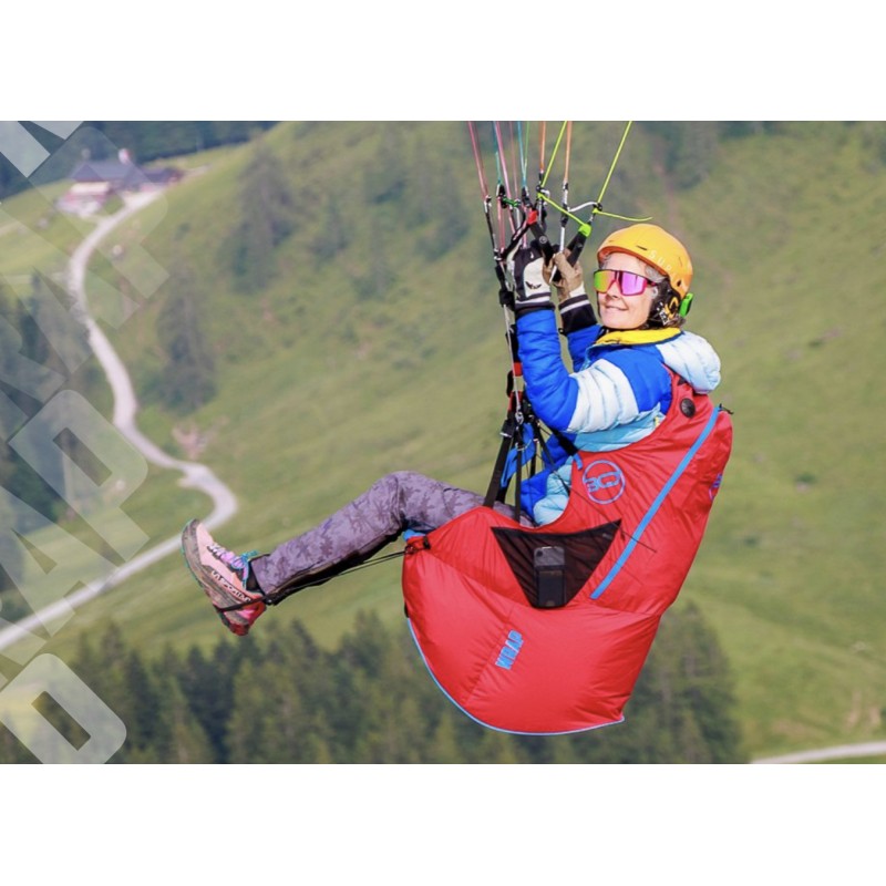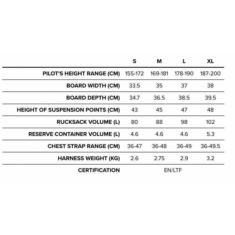 – Le conteneur de secours sous l'assise peut contenir un parachute de secours de 4,6 l, 5,3 l pour le modèle XL.